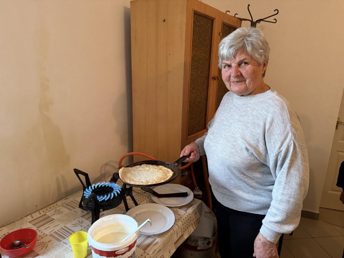 A nyugdíjas egyesület irodája előtt tábla hirdette az utcán, hogy megnyílt a Palacsinta Udvar. Nemcsak, hogy megnyílt, de meg is telt, méghozzá sok sok palacsintát falatozó gyerekkel és bizony felnőttel is. Baán Éva a nyugdíjas egyesület elnöke elmondta, hogy a nyári nagy siker után úgy gondolták, hogy az adventben is megédesítik a pápaiak életét és minden betérőt megkínálnak palacsintával. 5 serpenyőben folyamatosan készültek a finomságok, de csak egy féle tésztából. Van egy nyugdíjasunk a Fehér Viola - mondta Baán Éva, aki kitűnő háziasszony, ő a fő keverő, a tagtársak pedig sütik. Szerencsére gondosan előkészültek a nagy mennyiségű sütéshez, mert nem sokkal a kezdés után jöttek is az iskolások és a járókelők a finomságokra. Ahogy ilyenkor lenni szokott volt kakaós ízesítés, különféle lekváros, amit a nyugdíjasok hoztak be és persze egy kis forró tea is. Természetesen a főszakácstól megkérdeztük a jó palacsinta tészta titkát. Simára kell kikeverni, ez a lényege - mondta Fehér Viola. Ha szeretnénk, hogy ne ragadjon, akkor ne tegyünk bele cukrot. Viola tojásporral készíti a palacsintát a könnyebb kezelhetőség érdekében. A legszerényebb becslések szerint 400-450 db palacsinta készült kedd délután a nyugdíjas egyesület jóvoltából.